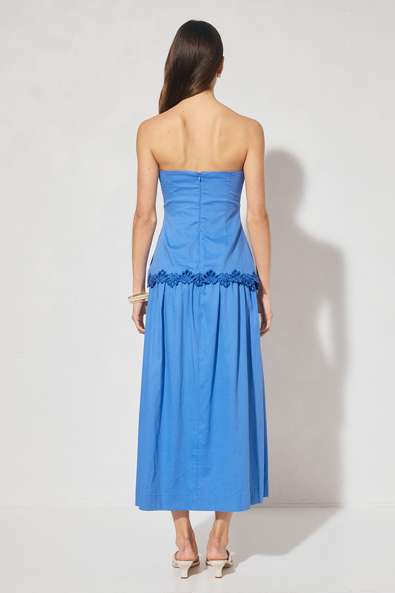 A feminine strapless midi dress in soft cotton-blend woven fabric, adorned with delicate scalloped embroidery. The longline bodice features gentle gathers over the bust and elasticated side panels for a comfortable, flattering fit. Flowing into a full gathered skirt, the dress creates a timeless fit-and-flare silhouette that moves beautifully with every step. Partially lined with an invisible back zipper, it’s perfect for summer garden parties, elegant daytime events, or celebratory occasions.