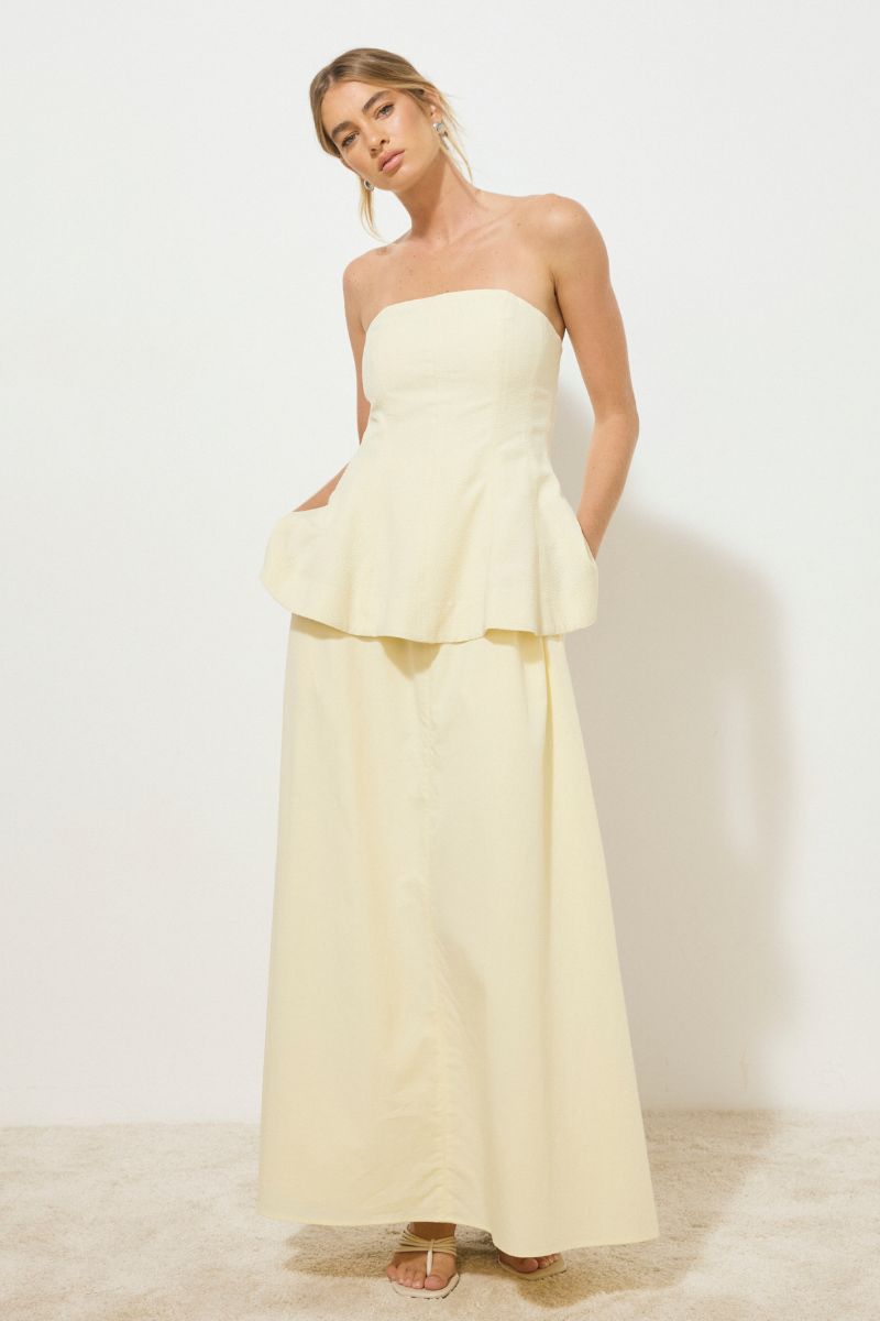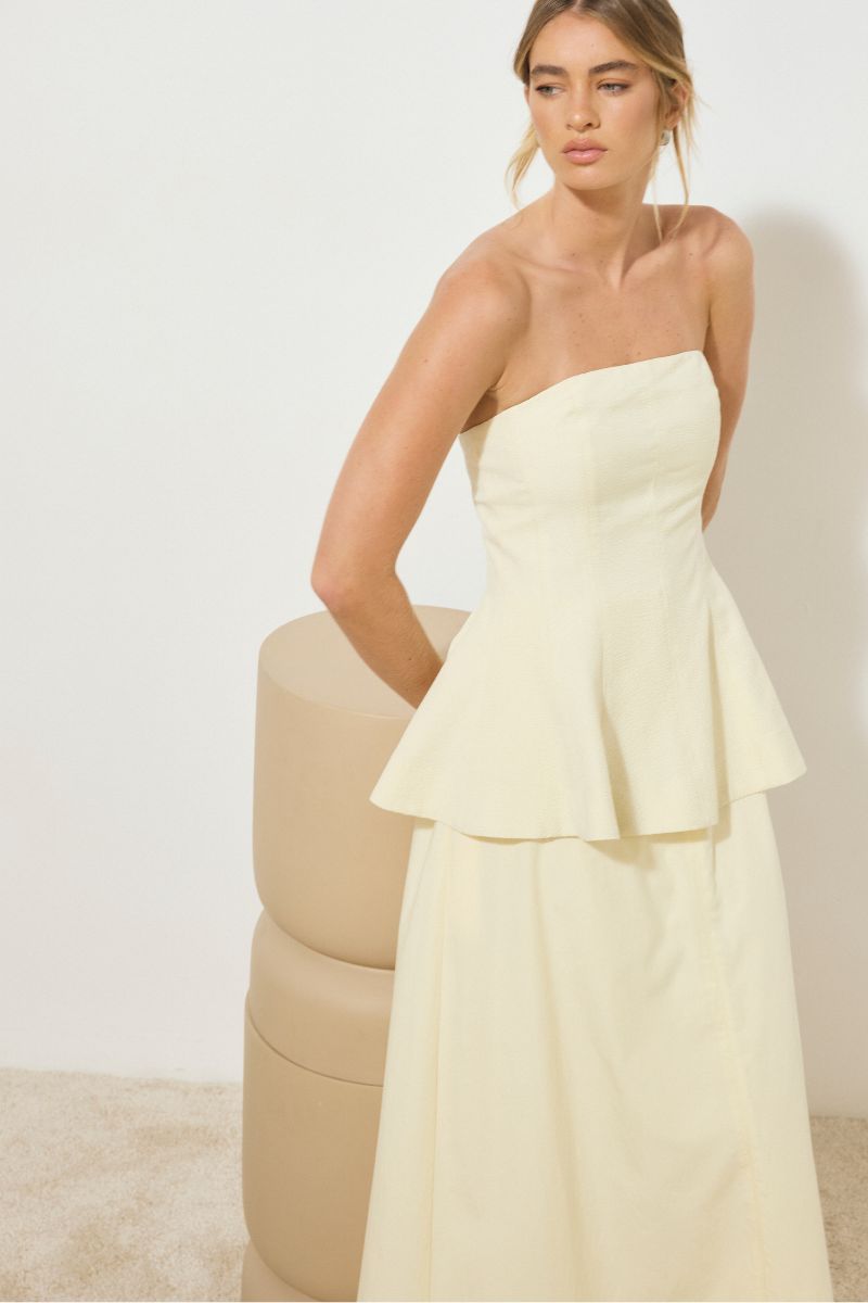 - Seersucker luxury - Slightly stretchy woven fabrication - Strapless long dress - Fit & flare silhouette - Straight across neckline - Featured longline bodice with panelled seams for cinched waist fit - Elasticated back bodice panels for adjustability - Full volume bodice hem - Woven A-line underskirt in contrast fabric - Inset pockets in each underskirt side seam - Invisible zipper closure at centre back - Fully lined