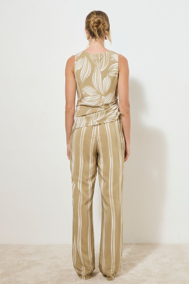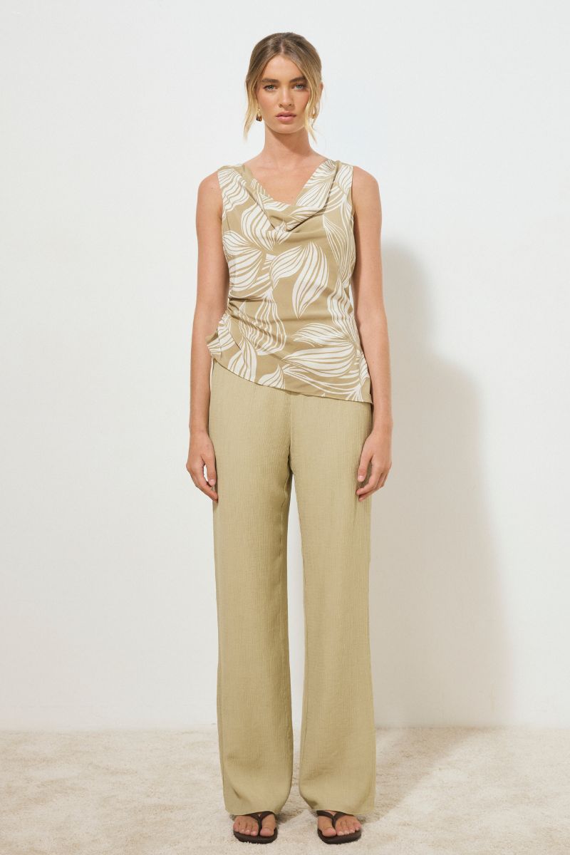 A sleeveless bias-cut top, crafted from a silky woven fabrication and adorned with an exclusive handcrafted print. Featuring a soft cowl neckline and relaxed fit, it is finished with a functional side drawcord that creates an asymmetrical hemline. Style with the Lotus pants for an elevated everyday look.