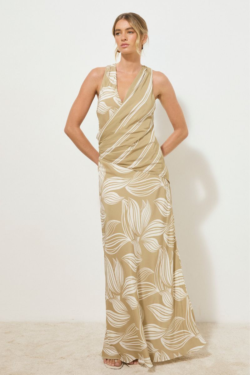 - Exclusive handcrafted print - Silky woven fabrication - Sleeveless long bias dress - Skimming fit - Featured print spliced at bodice overlay - Soft cowl cross-over V neckline - Asymmetrical front bodice overlay in contrast print - Flattering shoulder & side waist tucks - Invisible zipper closure - Partially lined