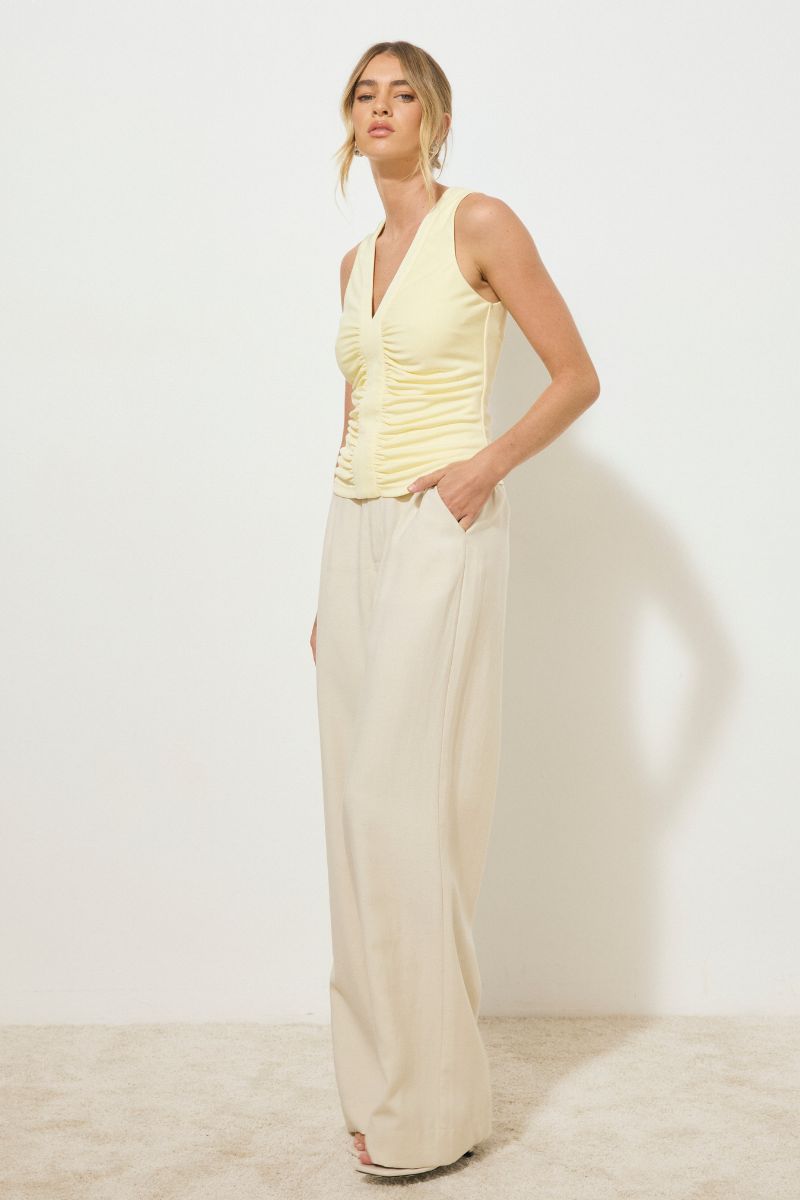 - Firm jersey knit fabrication - Sleeveless tank top - Featured band detail down centre front and along neck edge - Skimming fit - Low V neckline - Gathered bodice for flattering silhouette - Pull-on style - Fully lined