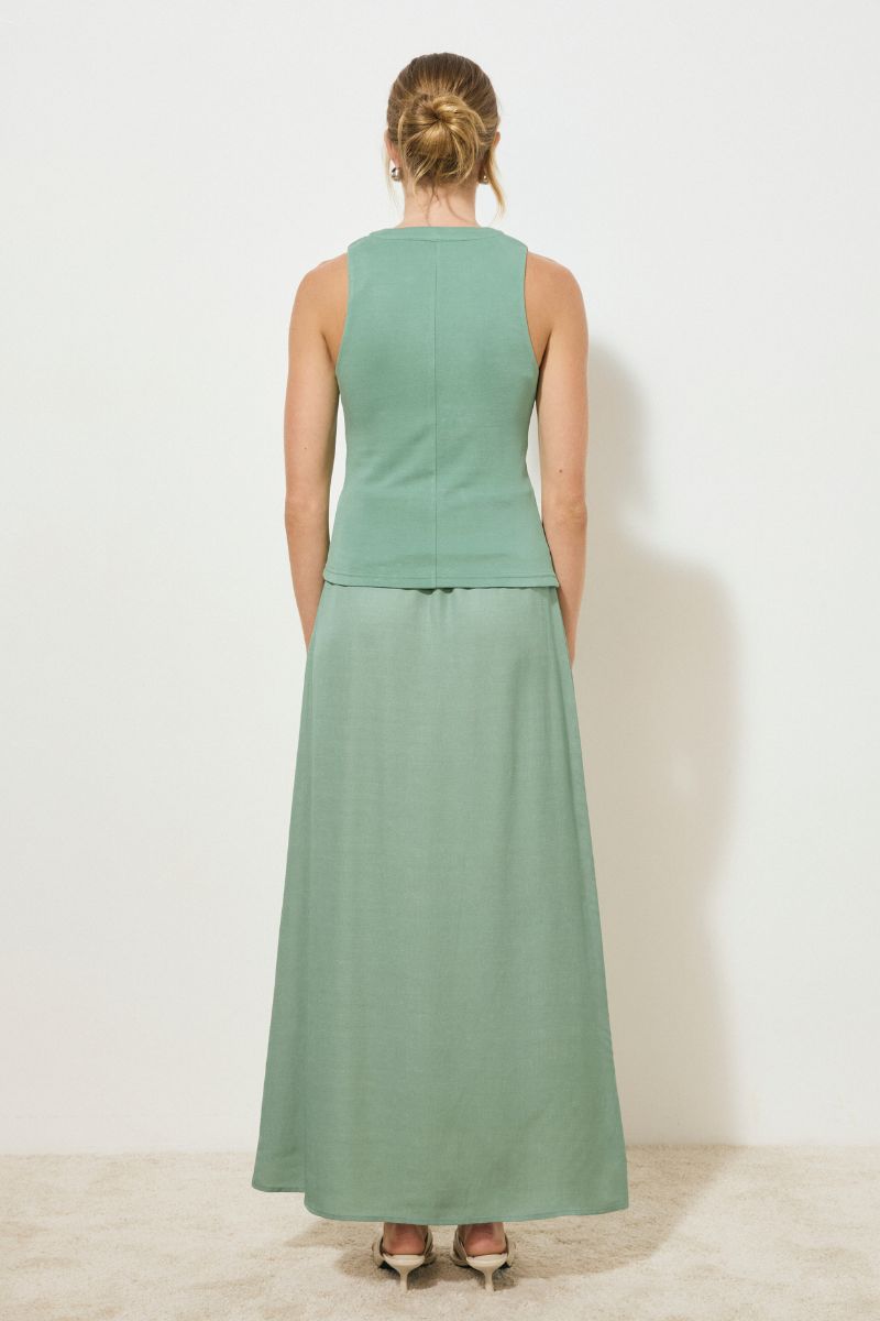 - Firm jersey knit fabrication - Sleeveless tank top - Featured band detail down centre front and along neck edge - Skimming fit - Low V neckline - Gathered bodice for flattering silhouette - Pull-on style - Fully lined