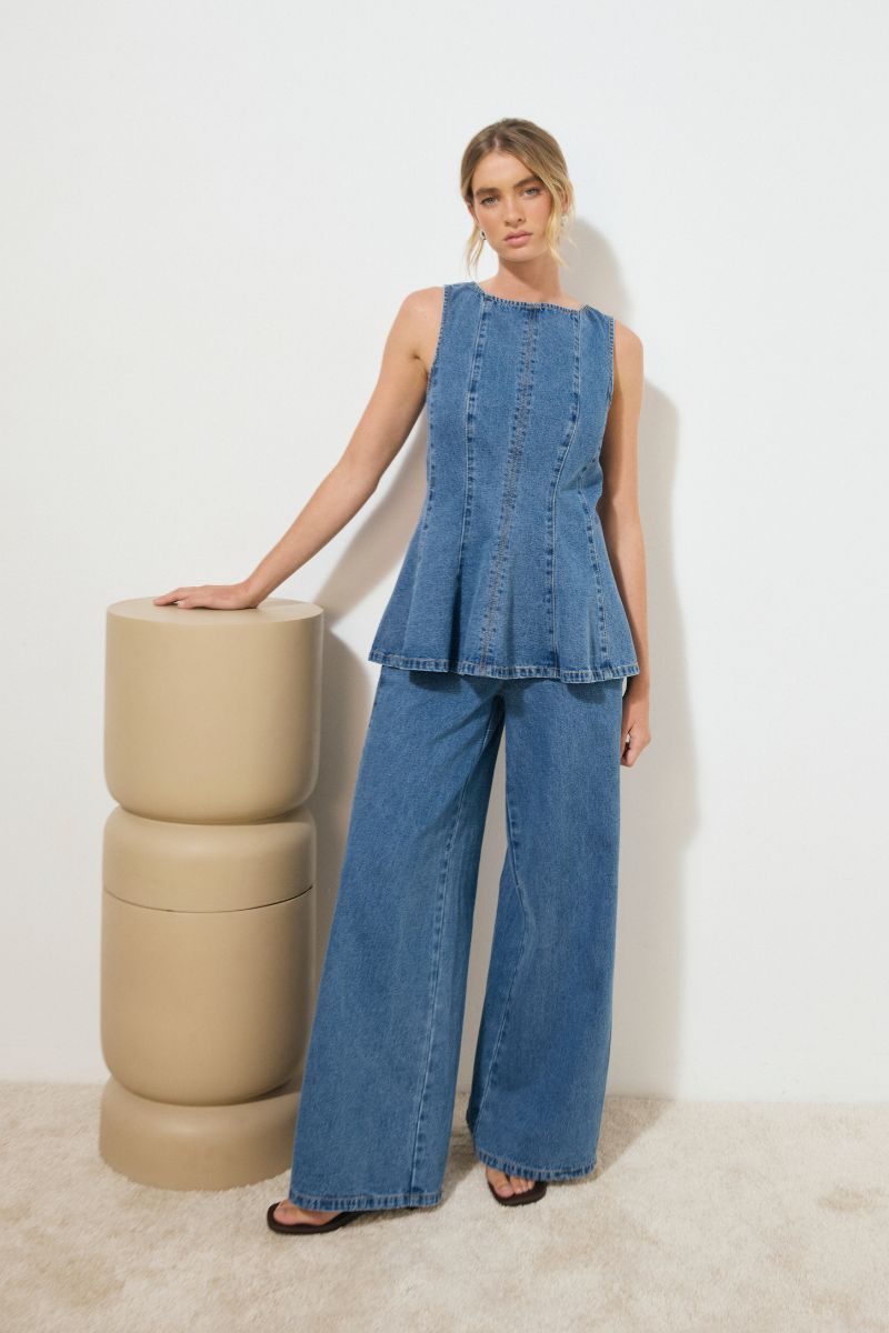 - Washed denim fabrication - Sleeveless top - Relaxed fit - Fit & flare silhouette - Soft boat neckline - Featured panelled seams - Back panel ties at waist for adjustability - Full volume hem - Back keyhole opening with button & loop closure - Heavy topstitching detail - Pull-on style