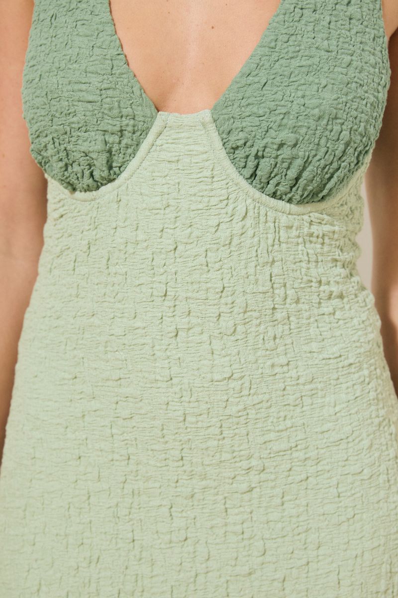 - Crinkled jersey knit fabrication - Long stretchy dress - Skimming fit & flare silhouette - Low bridged neckline - Sleeveless - Featuring flattering gathered contrast bust panel - Cupped construction with underwire - Pull-on style - Fully lined