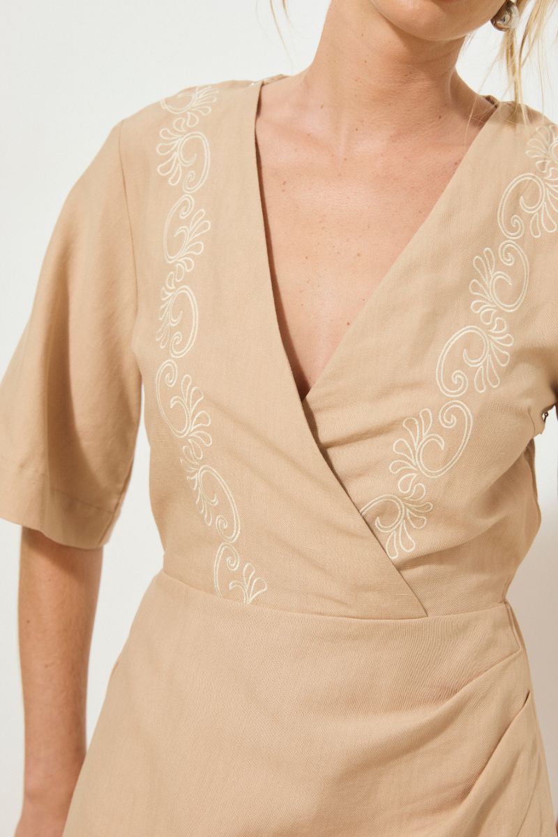 - Linen blend woven fabrication - Fixed wrap mini dress - Skimming fit - Fixed cross-over front bodice creating deep V neckline - Featured front bodice embroidery - Fluted short sleeve - Curved asymmetrical front skirt overlay with tuck detail - Invisible zipper closure - Elasticated back waist for adjustability - Partially lined