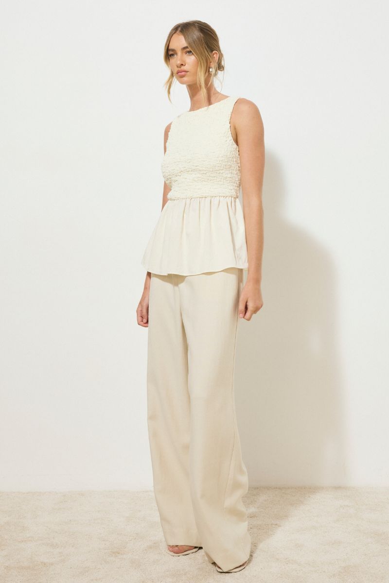 - Featuring gathered hem peplum in non-stretch woven fabrication